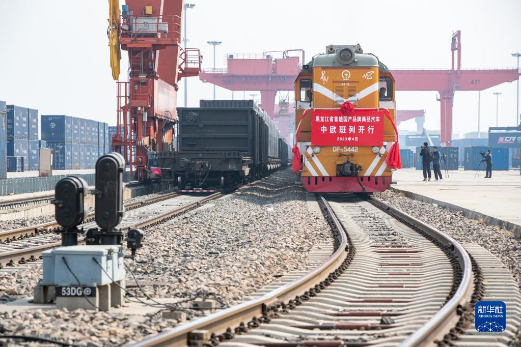 當日,在哈爾濱國際集裝箱中心站,黑龍江省開行的首趟國產品牌商品汽車中歐班列發車。該趟班列共載有165臺出口的國產品牌商品汽車。