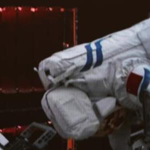 4月15日在北京航天飛行控制中心拍攝的神舟十五號航天員費俊龍結束出艙任務返回問天實驗艙時敬禮的畫面。