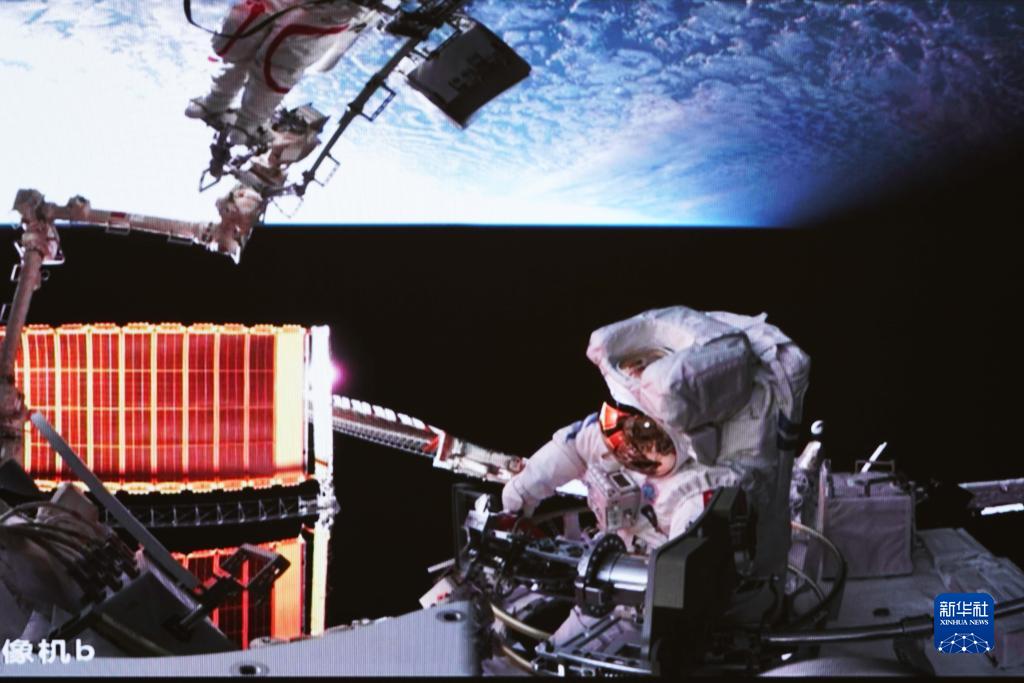 4月15日在北京航天飛行控制中心拍攝的神舟十五號航天員張陸(下)成功出艙的畫面。