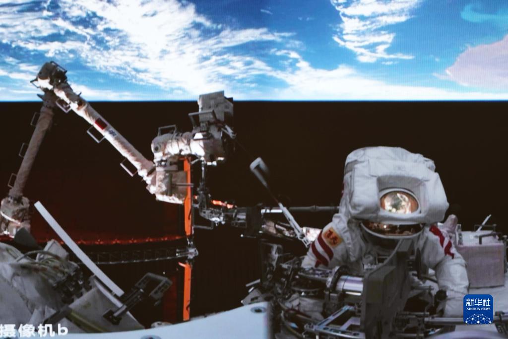 4月15日在北京航天飛行控制中心拍攝的神舟十五號航天員費(fèi)俊龍成功出艙的畫面。