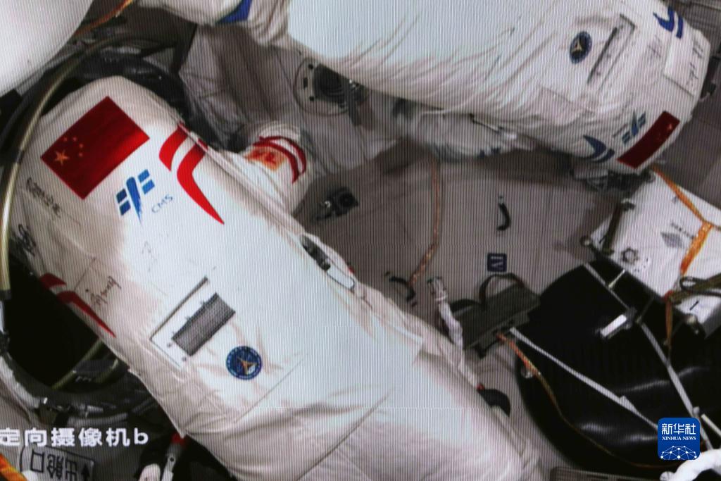 4月15日在北京航天飛行控制中心拍攝的神舟十五號航天員費俊龍(左)開啟問天實驗艙氣閘艙出艙艙門的畫面。