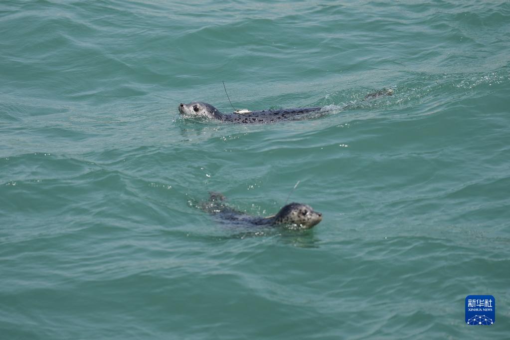 4月16日,被放歸的西太平洋斑海豹在大連市旅順口區附近海域活動。