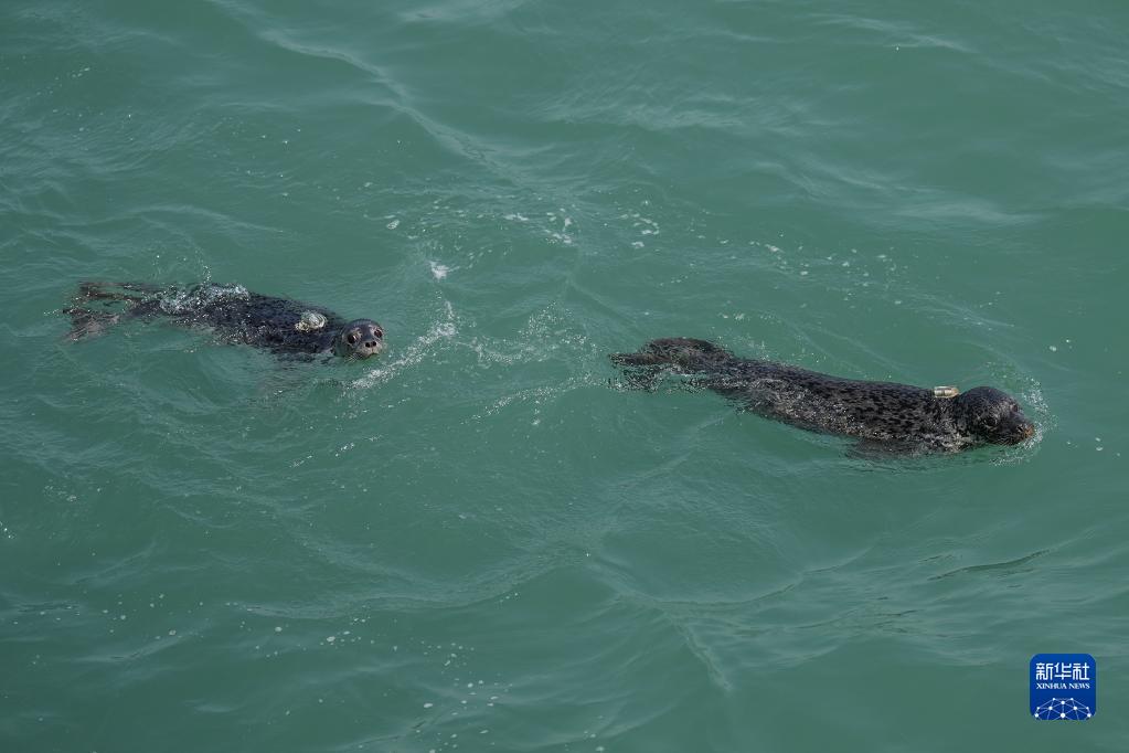 4月16日,被放歸的西太平洋斑海豹在大連市旅順口區附近海域活動。