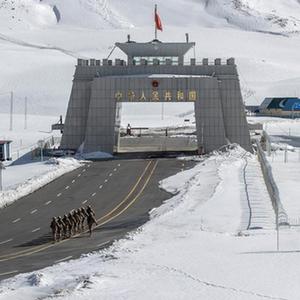 4月13日,邊防連官兵在紅其拉甫國(guó)門(mén)巡邏。