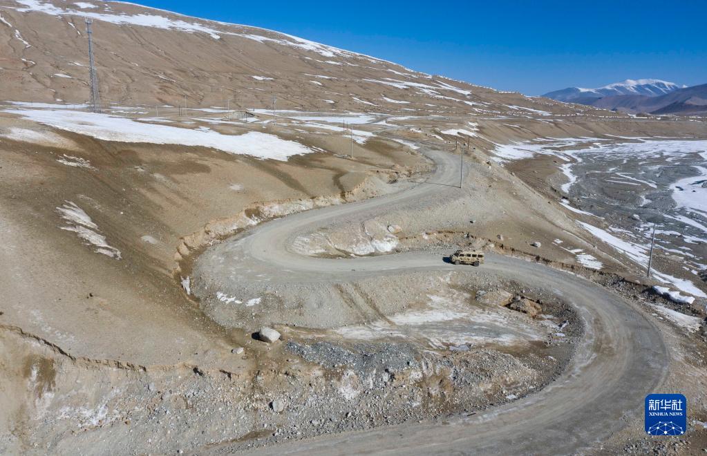 4月14日,邊防連戰(zhàn)士在乘車巡邏(無人機照片)。