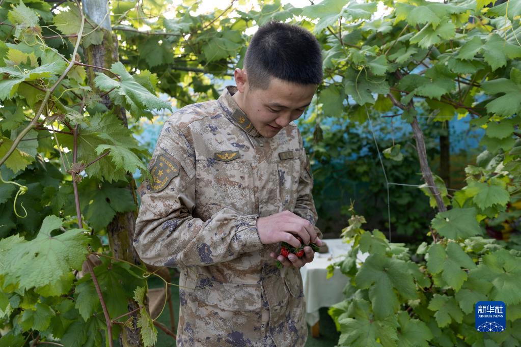 4月13日,邊防連戰士董興森手捧剛剛采摘的草莓。