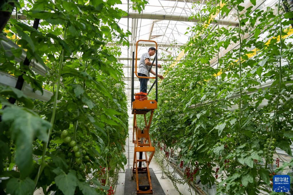 4月17日,在河北省永清縣龍虎莊鄉(xiāng)農(nóng)業(yè)農(nóng)村部規(guī)劃設(shè)計(jì)研究院永清精準(zhǔn)試驗(yàn)基地內(nèi),工作人員對(duì)西紅柿進(jìn)行繞蔓。