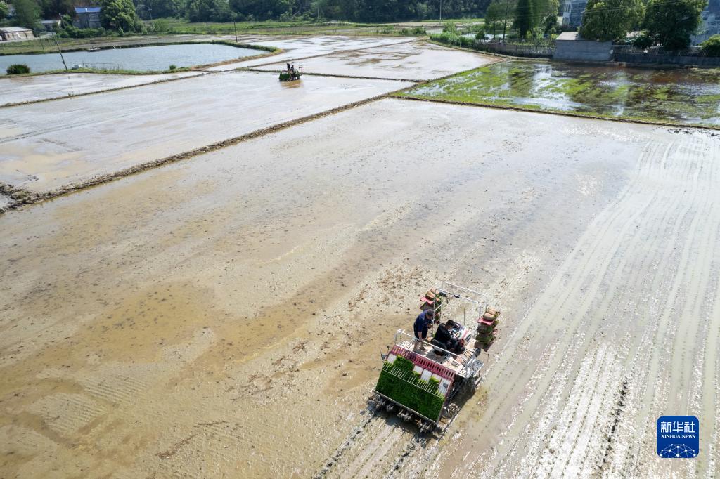 4月17日,在長沙市望城區烏山街道黃花嶺村,村民駕駛插秧機進行水稻插秧作業(無人機照片)。