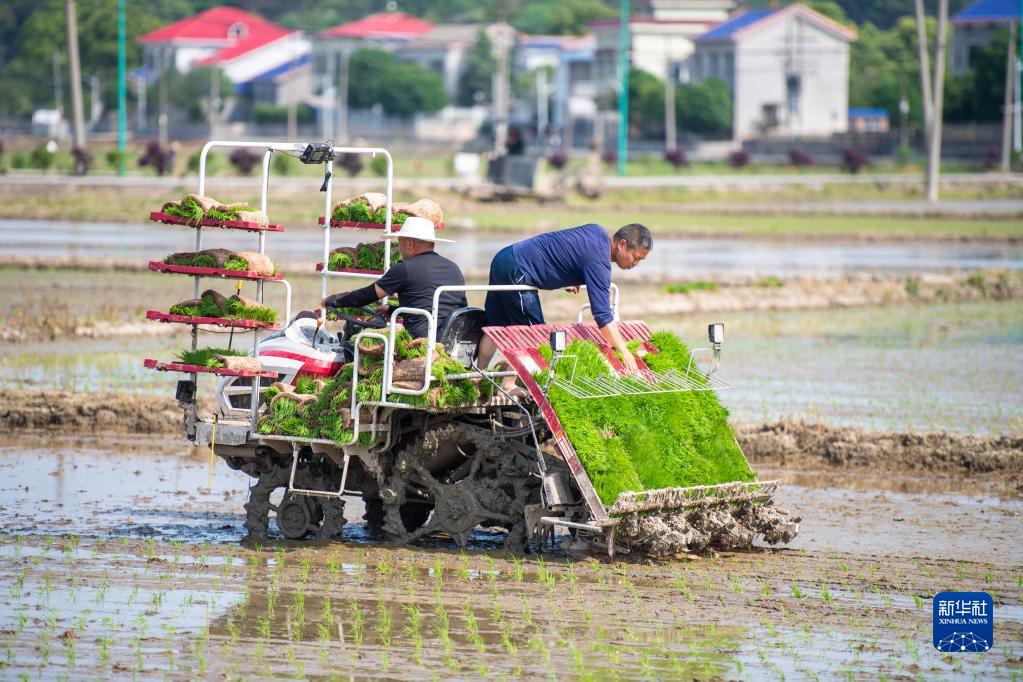 4月17日,在長沙市望城區烏山街道黃花嶺村,村民駕駛插秧機進行水稻插秧作業。