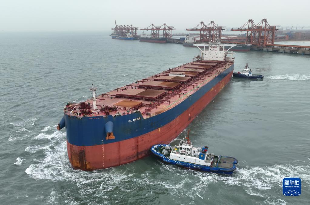 4月17日,一艘輪船在拖輪的協助下駛離唐山港曹妃甸港區礦石碼頭(無人機照片)。