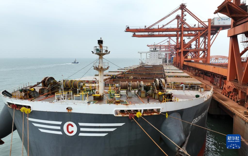 4月17日,一艘輪船靠泊在唐山港曹妃甸港區礦石碼頭(無人機照片)。
