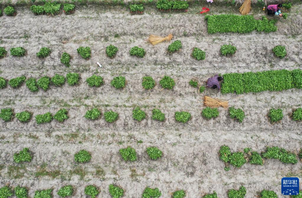 4月17日,村民在貴州省黔東南苗族侗族自治州從江縣剛邊壯族鄉良田村中藥材種植基地采收板藍根苗(無人機照片)。