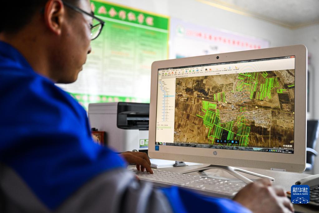 4月12日,在通遼市科爾沁左翼中旗腰林毛都鎮,一家農業合作社的負責人查看今年耕種的衛星地圖。