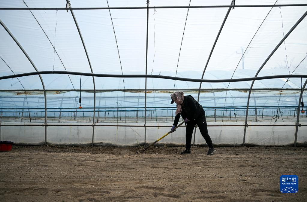 4月14日,在通遼市科爾沁左翼后旗甘旗卡鎮(zhèn),工人在水稻育苗大棚里整理土地。
