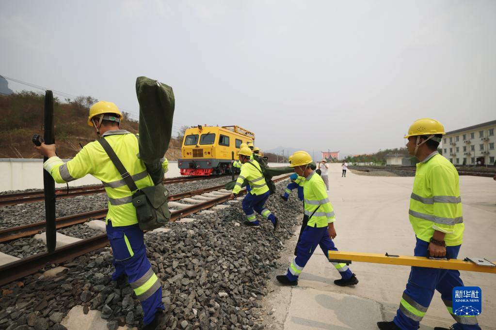 4月17日,瑯勃拉邦維保管理中心的工人在老撾瑯勃拉邦站附近進(jìn)行接觸網(wǎng)維修保養(yǎng)演練。