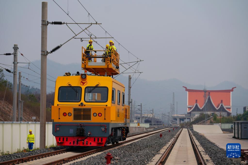 4月17日,瑯勃拉邦維保管理中心的工人在老撾瑯勃拉邦站附近進行接觸網(wǎng)維修保養(yǎng)演練。