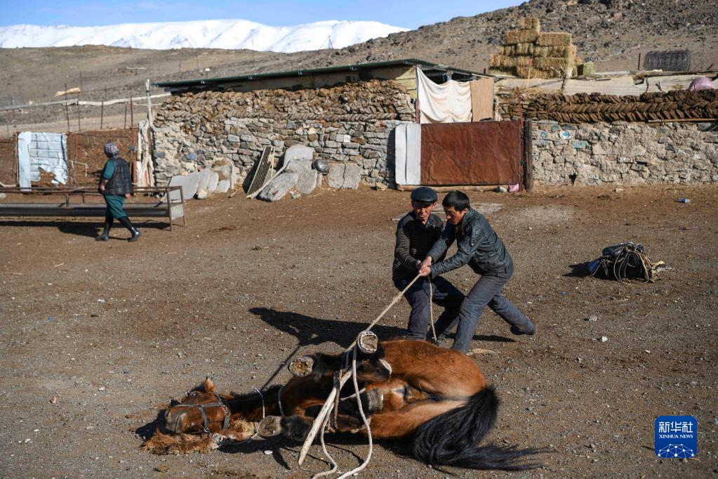 哈布得拉什么(前左)和兒子賽孜木合力把需要修理馬掌的馬匹翻身,巴哈提從一旁經過,去羊圈檢查是否有小羊羔出生(4月13日攝)。