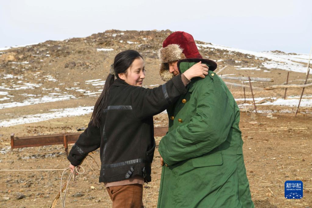 哈布得拉什么準備騎馬外出尋找羊群,小女兒昆樹阿克從屋內(nèi)拿來厚大衣,一手牽著馬,一手幫父親整理衣領(lǐng)(2月14日攝)。