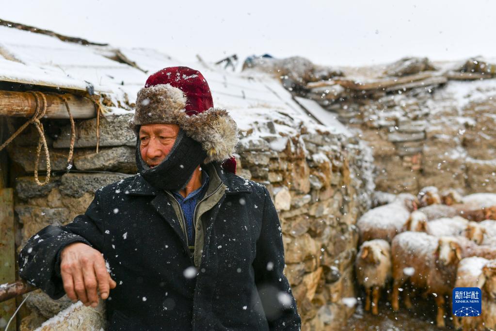 春羔生產(chǎn)高峰期突然降雪,哈布得拉什么在羊圈里檢查,看是否有小羊羔出生(4月12日攝)。