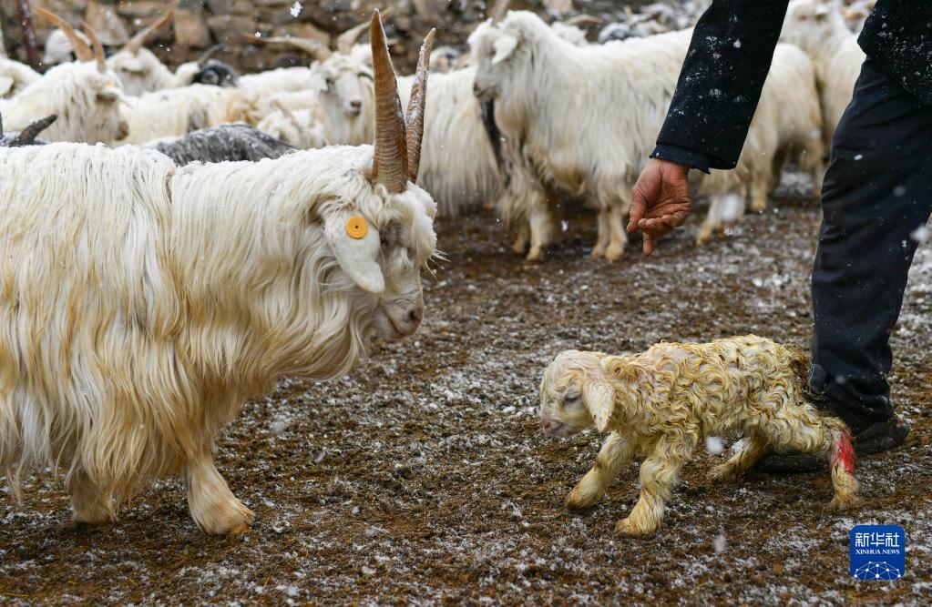 哈布得拉什么幫助一只當(dāng)天上午出生的小羊羔回到母羊身邊吃奶(4月12日攝)。