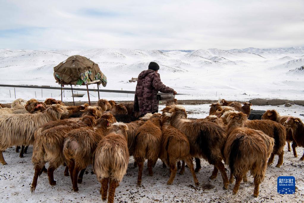 巴哈提的兒子賽孜木給羊群喂飼料(2月14日攝)。