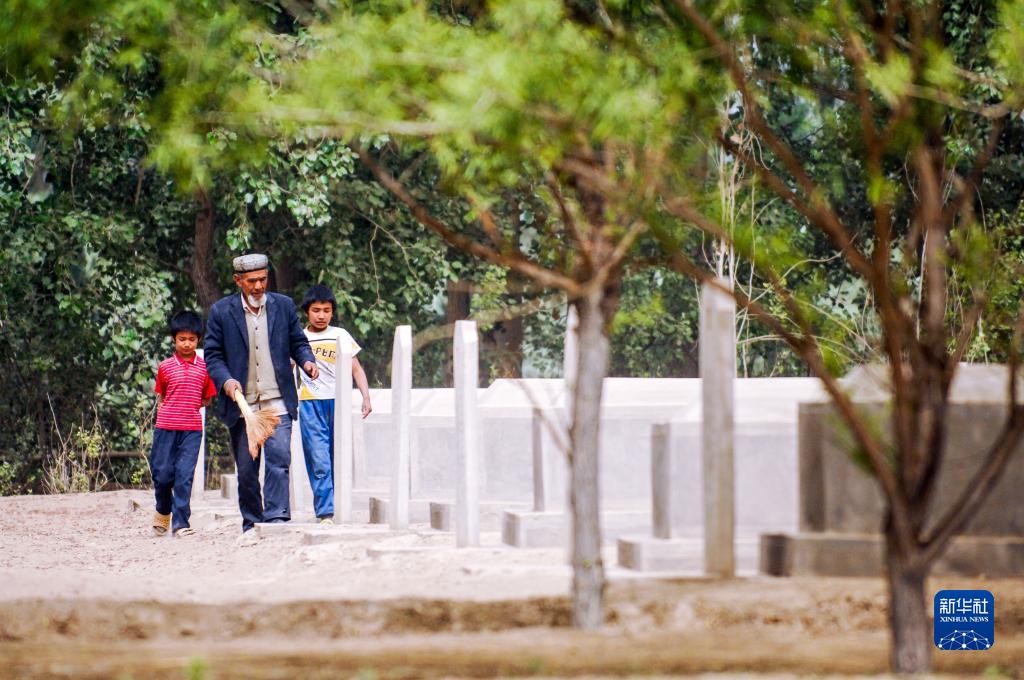 艾買爾·依提生前帶著兩個(gè)孫子在陵園掃墓(2011年4月30日攝)。