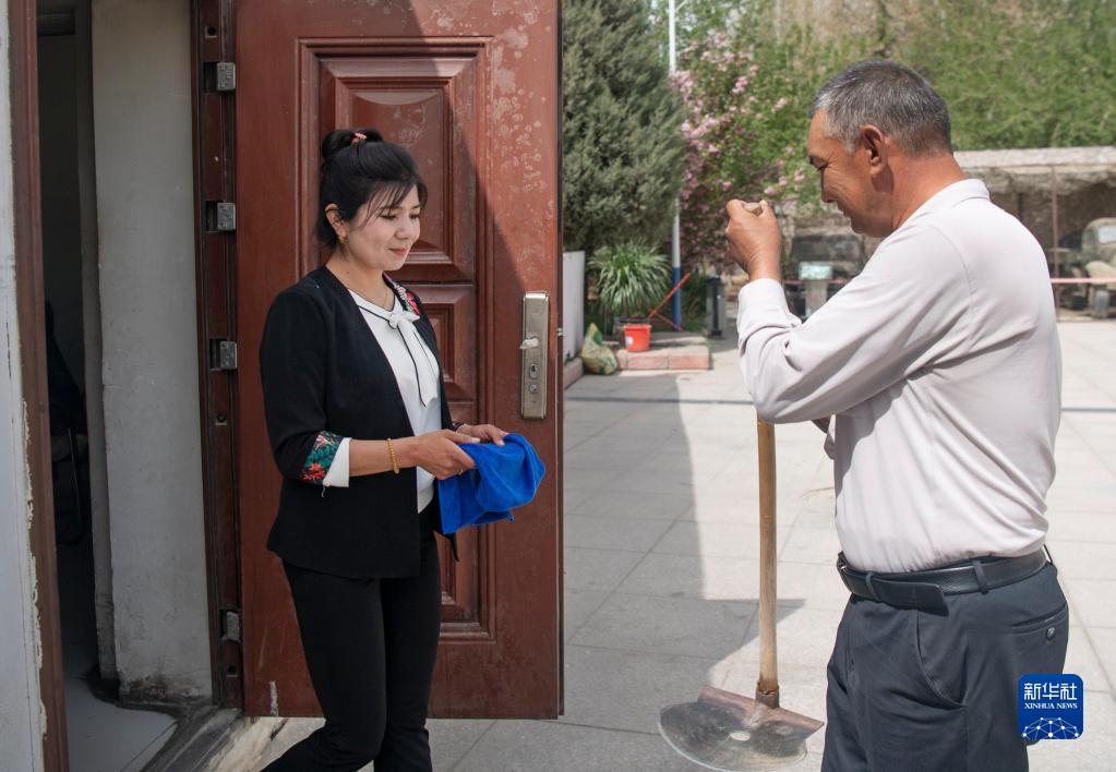 4月16日,在葉城烈士陵園,艾尼瓦爾·艾買爾(右)除草后,妻子給他遞上毛巾。