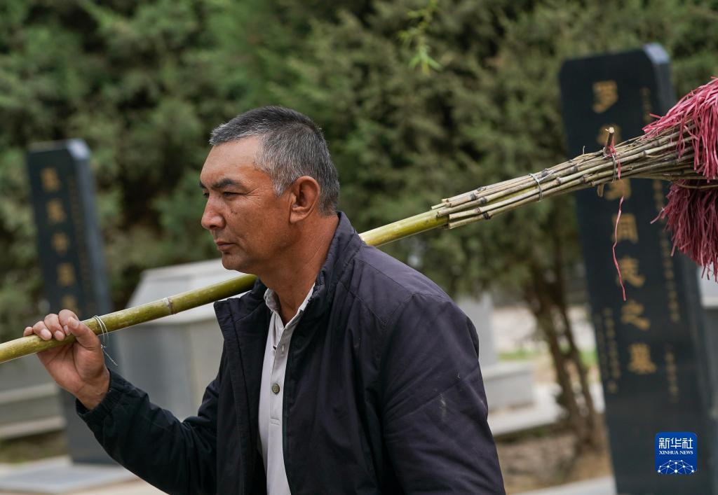 4月16日,在新疆葉城烈士陵園,艾尼瓦爾·艾買爾肩扛掃把準(zhǔn)備去打掃陵園。