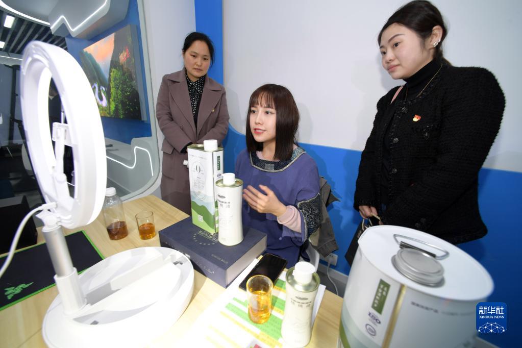 工作人員在貴州省遵義市村級集體經濟發展中心線上銷售農特產品(3月23日攝)。
