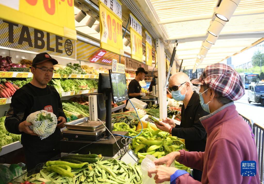 4月18日,市民(右)在位于北京市朝陽區柳芳公交場站東北角的“公交便民驛棧”選購蔬菜。