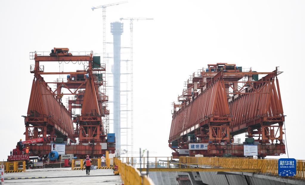 這是4月18日拍攝的在黃茅海跨海通道黃茅海大橋上作業(yè)的架橋設(shè)備。
