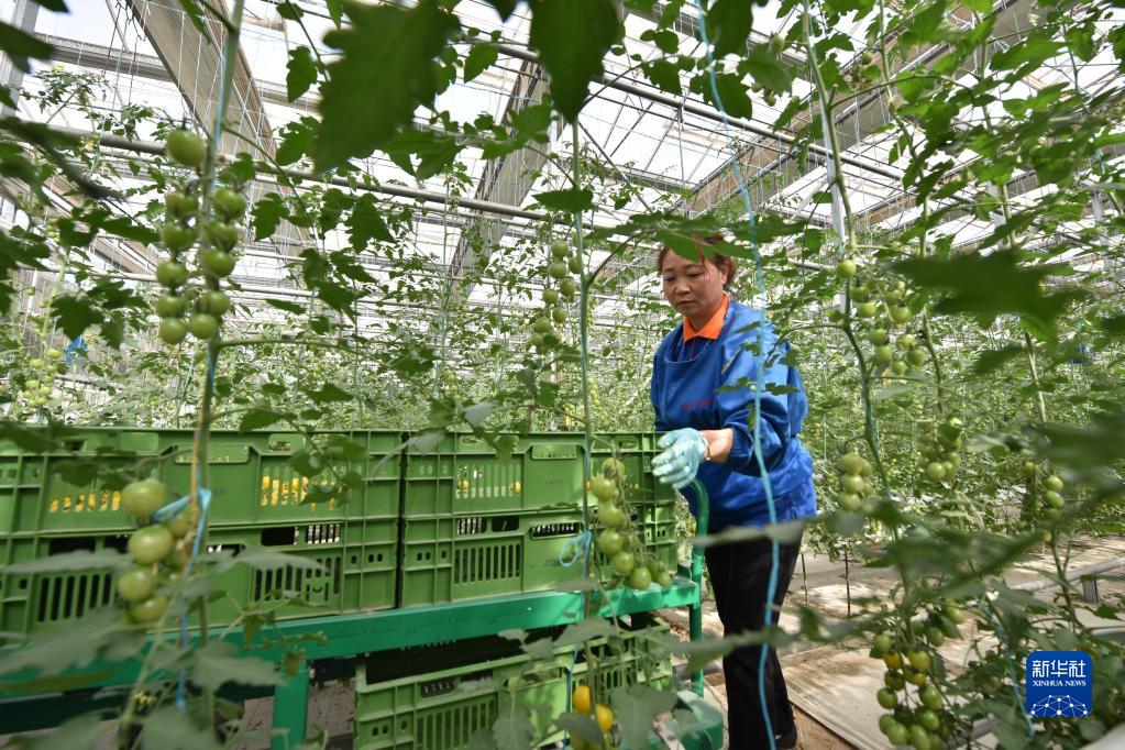 4月18日,河北省邢臺市南和區賈宋鎮一家現代農業園區工人在采摘西紅柿。