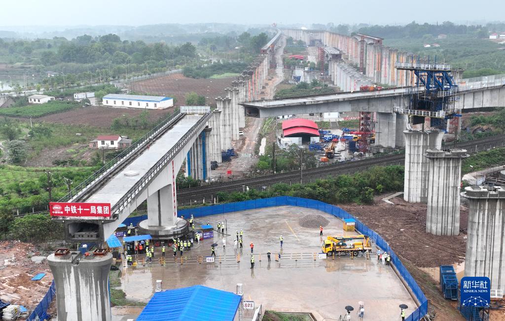 滬渝蓉高速鐵路荊門特大橋跨焦柳鐵路連續(xù)梁完成轉體(4月18日攝,無人機照片)。