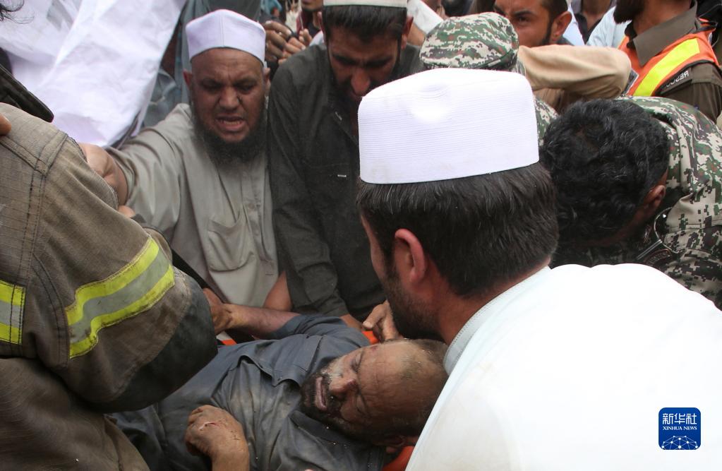4月18日,在巴基斯坦開伯爾-普什圖省多爾哈姆,人們在山體滑坡現場轉移傷者。