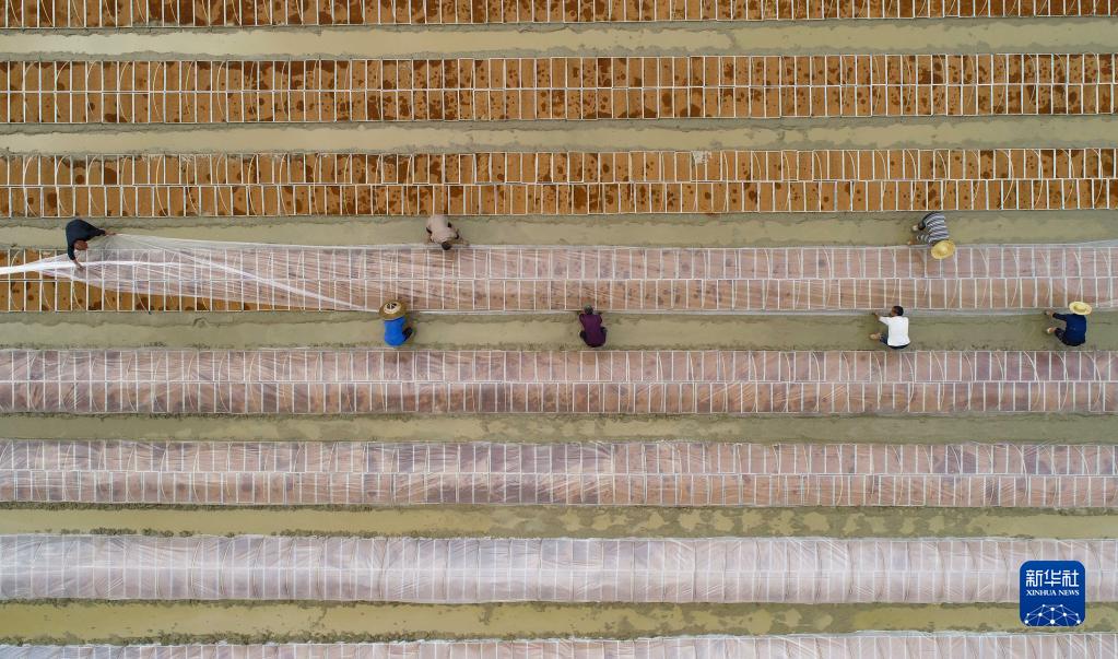 4月18日,農民在貴州省銅仁市松桃苗族自治縣烏羅鎮岑司村田間覆膜(無人機照片)。