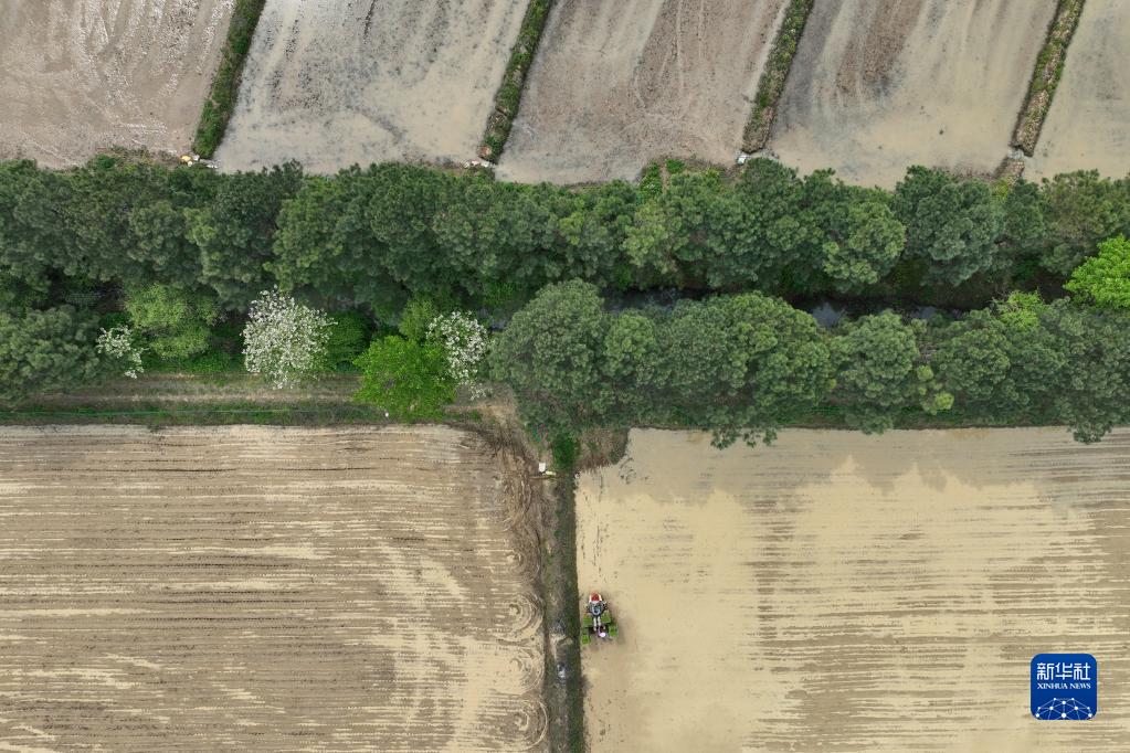 4月18日,在江蘇鎮(zhèn)江句容市天王鎮(zhèn)戴莊村,村民駕駛插秧機(jī)進(jìn)行早稻插秧工作(無(wú)人機(jī)照片)。