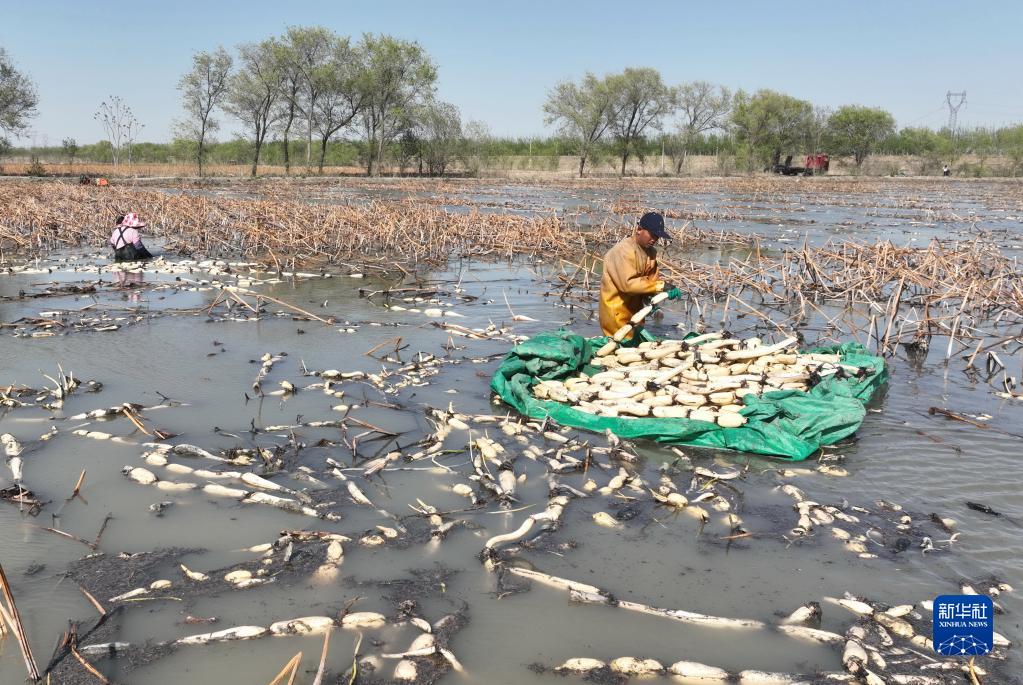 4月19日,唐山市豐南區東田莊鄉大吳莊村農民在水塘里采收蓮藕(無人機照片)。