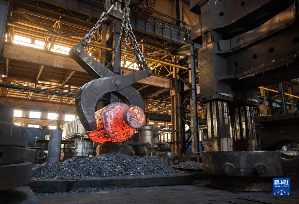 4月18日,在位于黑龍江省齊齊哈爾市的中國一重生產(chǎn)車間,吊鉗正吊運鍛件。
