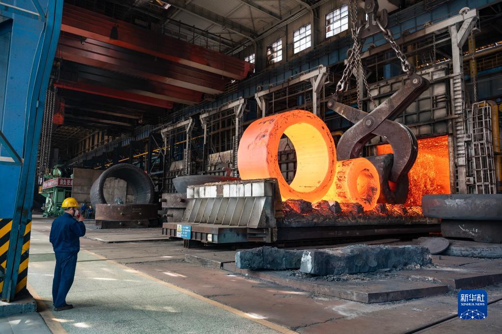 4月18日,工人在位于黑龍江省齊齊哈爾市的中國一重生產(chǎn)車間進(jìn)行生產(chǎn)作業(yè)。