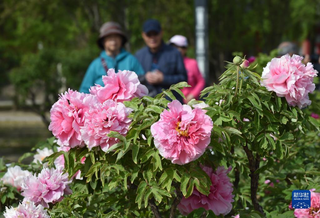 4月19日,游客在北京圓明園內欣賞盛開的牡丹花。