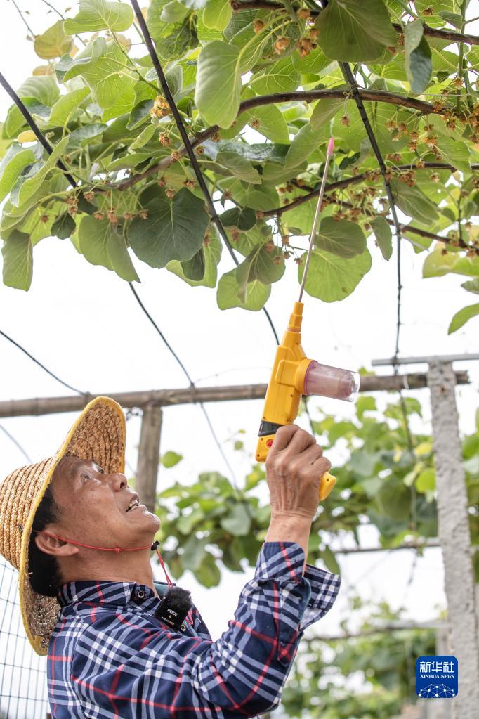 4月18日,在大湖鄉東姚村湖東果蔬農民專業合作社種植基地,村民在給獼猴桃進行人工授粉。