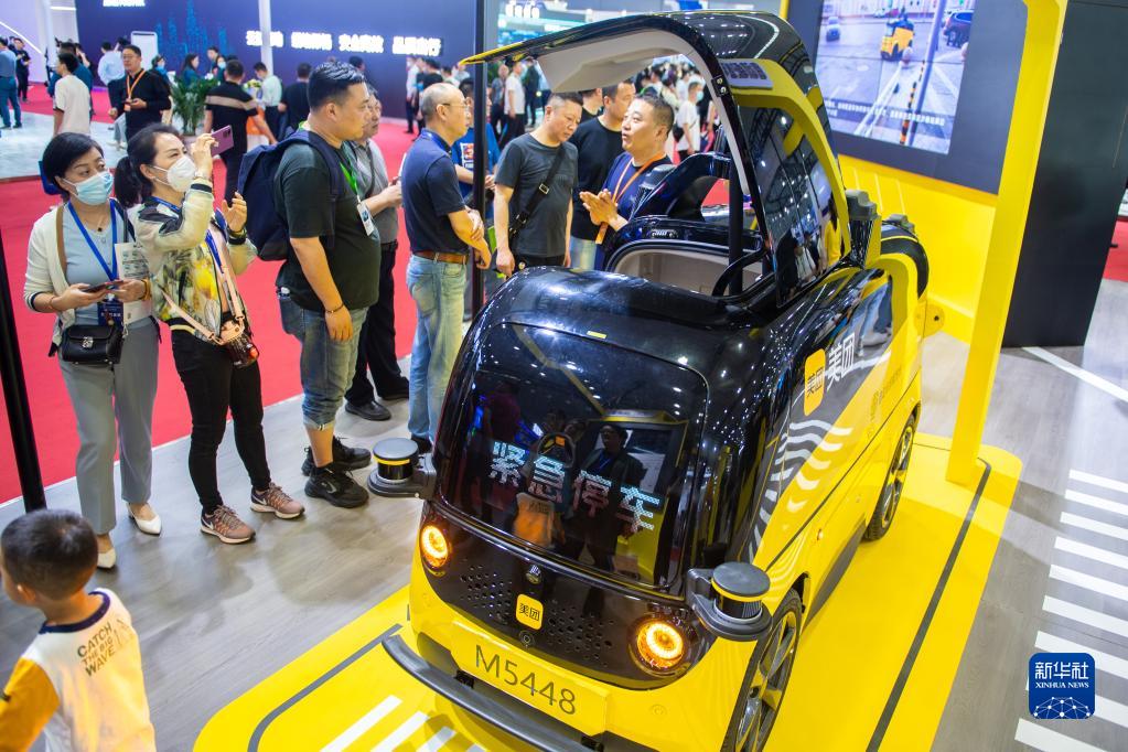 4月19日,在長沙國際會展中心,工作人員(右一)向觀眾介紹無人送餐車。