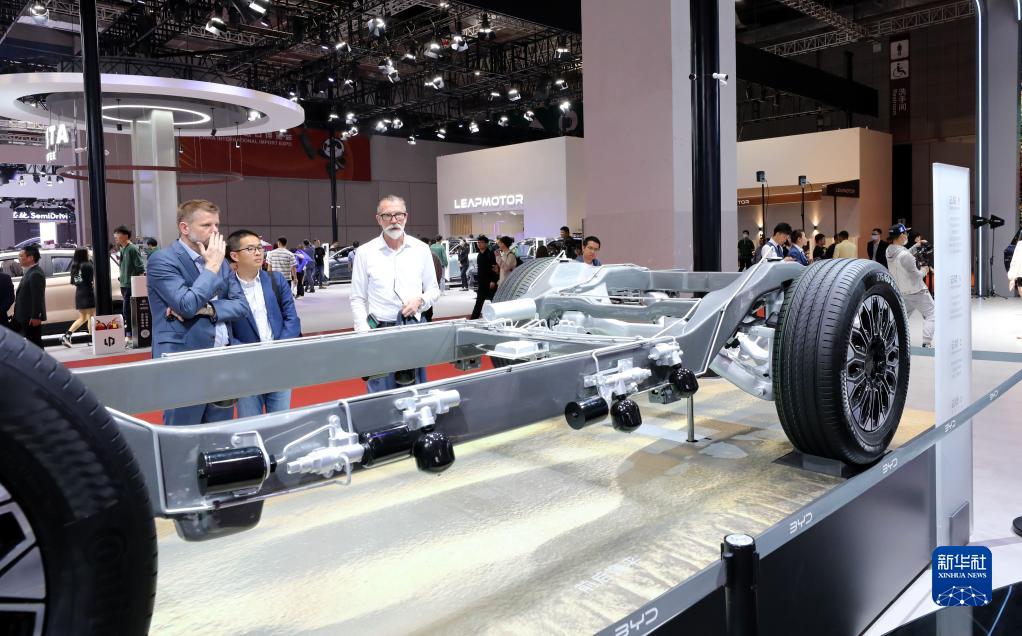 4月19日,參觀者在比亞迪汽車展臺展出的智能液壓車身控制系統(tǒng)展品前駐足觀看。
