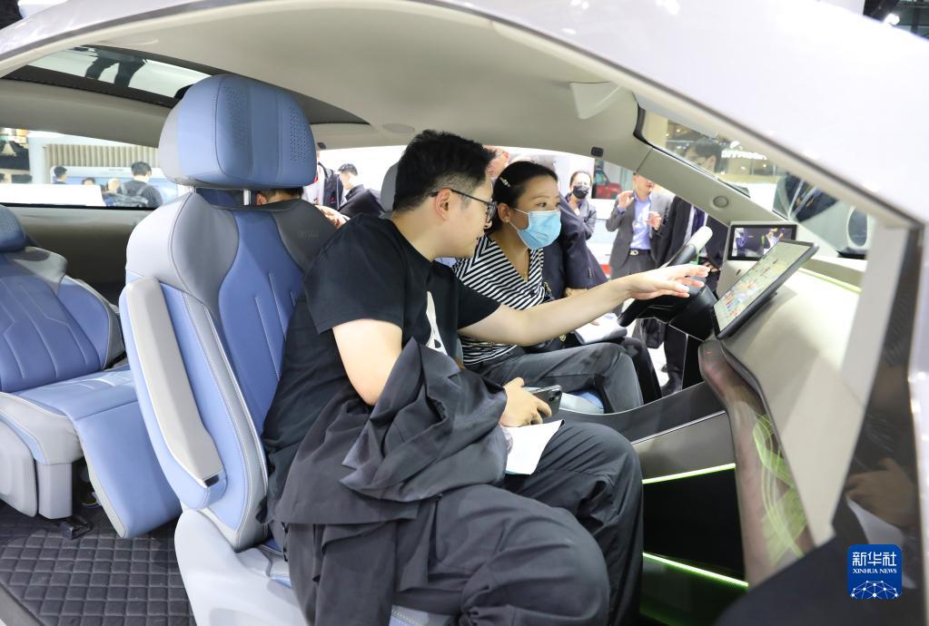 4月18日,參觀者在華為展臺體驗基于鴻蒙系統(tǒng)的車載智能終端。