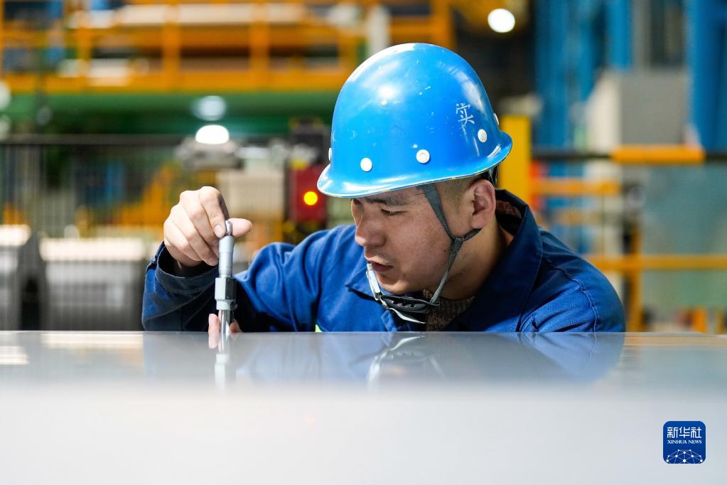 4月19日,工作人員在對取向電工鋼產品進行檢測。