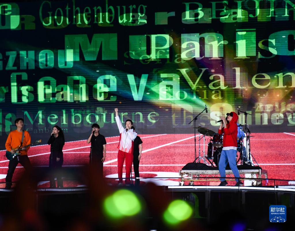 4月19日,在成都大運會倒計時100天啟動儀式上,跳水世界冠軍施廷懋(左四)和樂隊一起演唱歌曲《夢想的冠軍》。