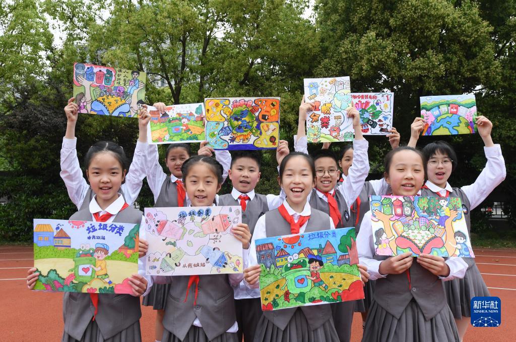4月20日,湖州新風(fēng)實(shí)驗(yàn)小學(xué)下塘校區(qū)的學(xué)生展示自己創(chuàng)作的環(huán)保主題的畫作。