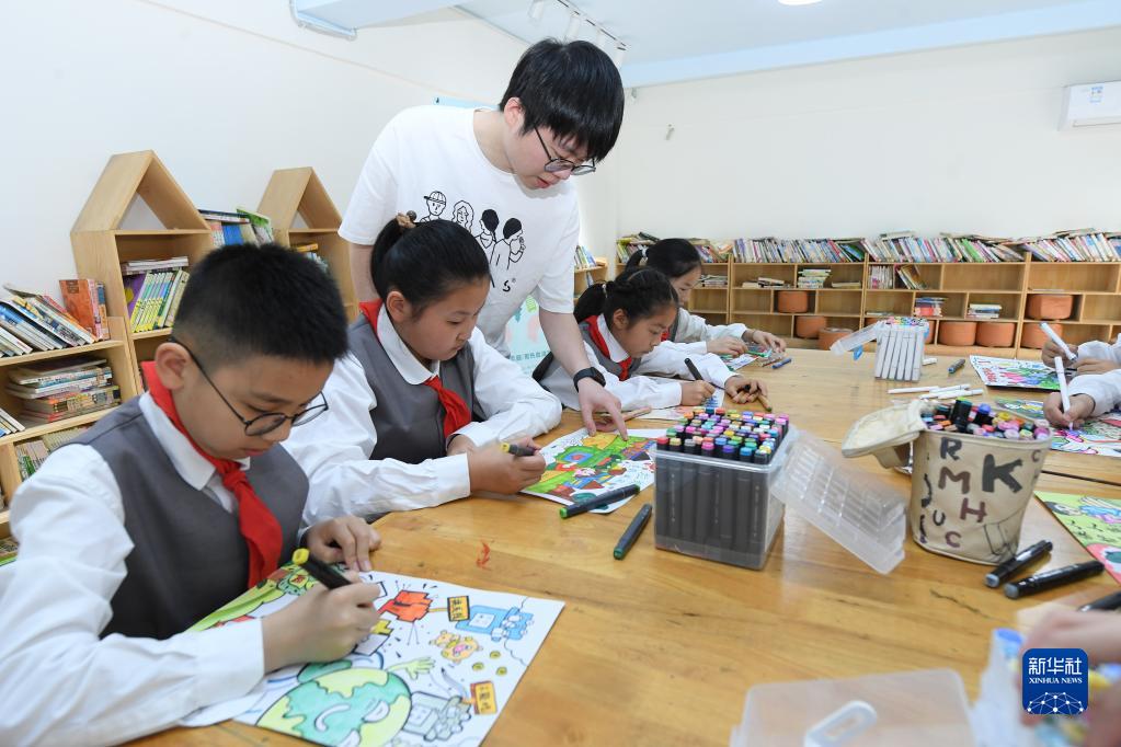 4月20日,湖州新風實驗小學下塘校區的學生在老師指導下創作環保主題的畫作。