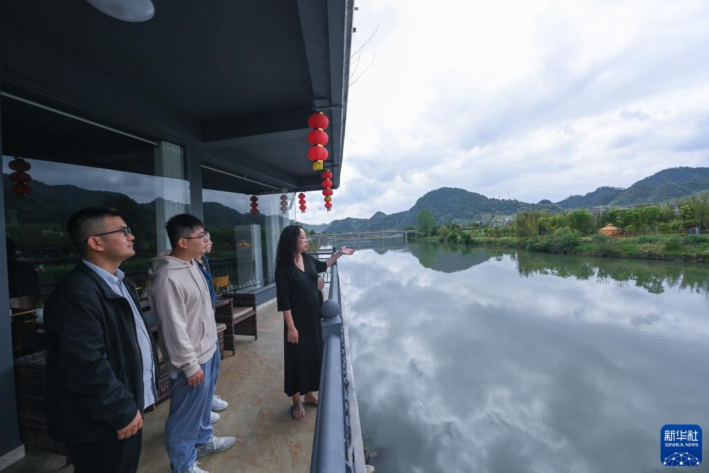 4月20日,在杭州市臨安區昌化鎮白牛村,羅星玥(右一)向游客介紹白牛村的自然風光。2022年,羅星玥帶著運營團隊在白牛村布局牛文化博物館、鄉村小酒館等業態,成為白牛村村落景區的投資運營商。