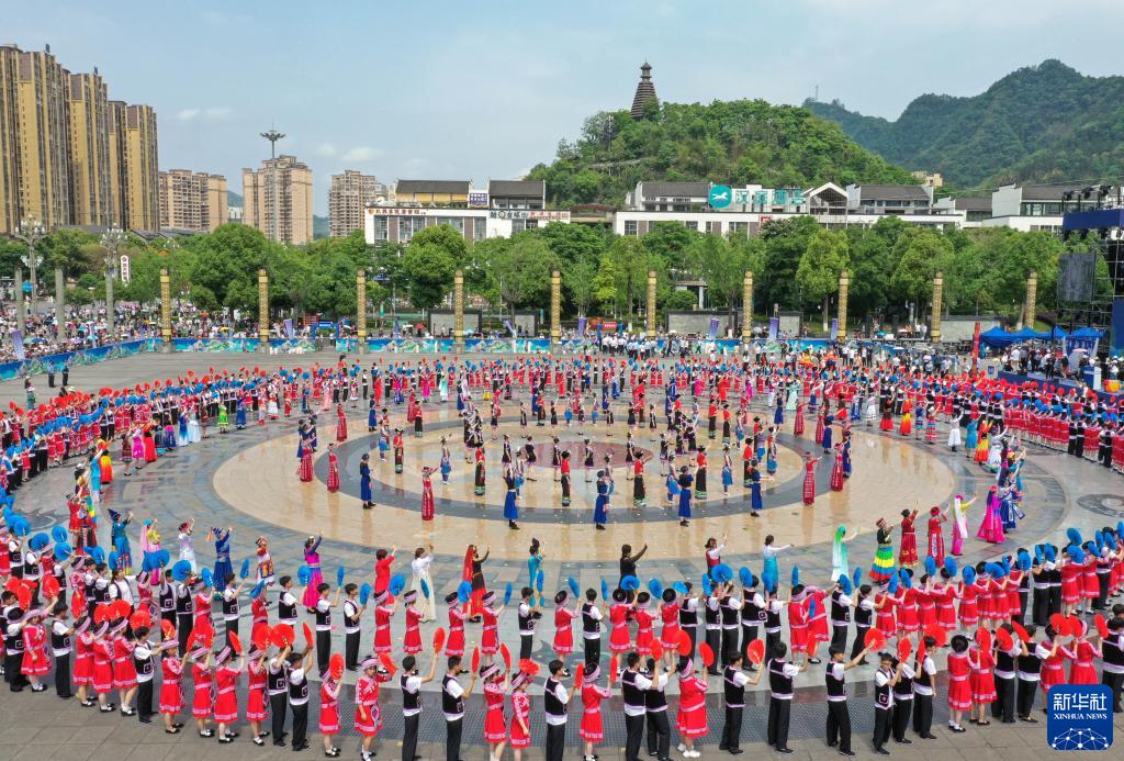 4月20日,當地群眾載歌載舞歡度苗族花山節(無人機照片)。